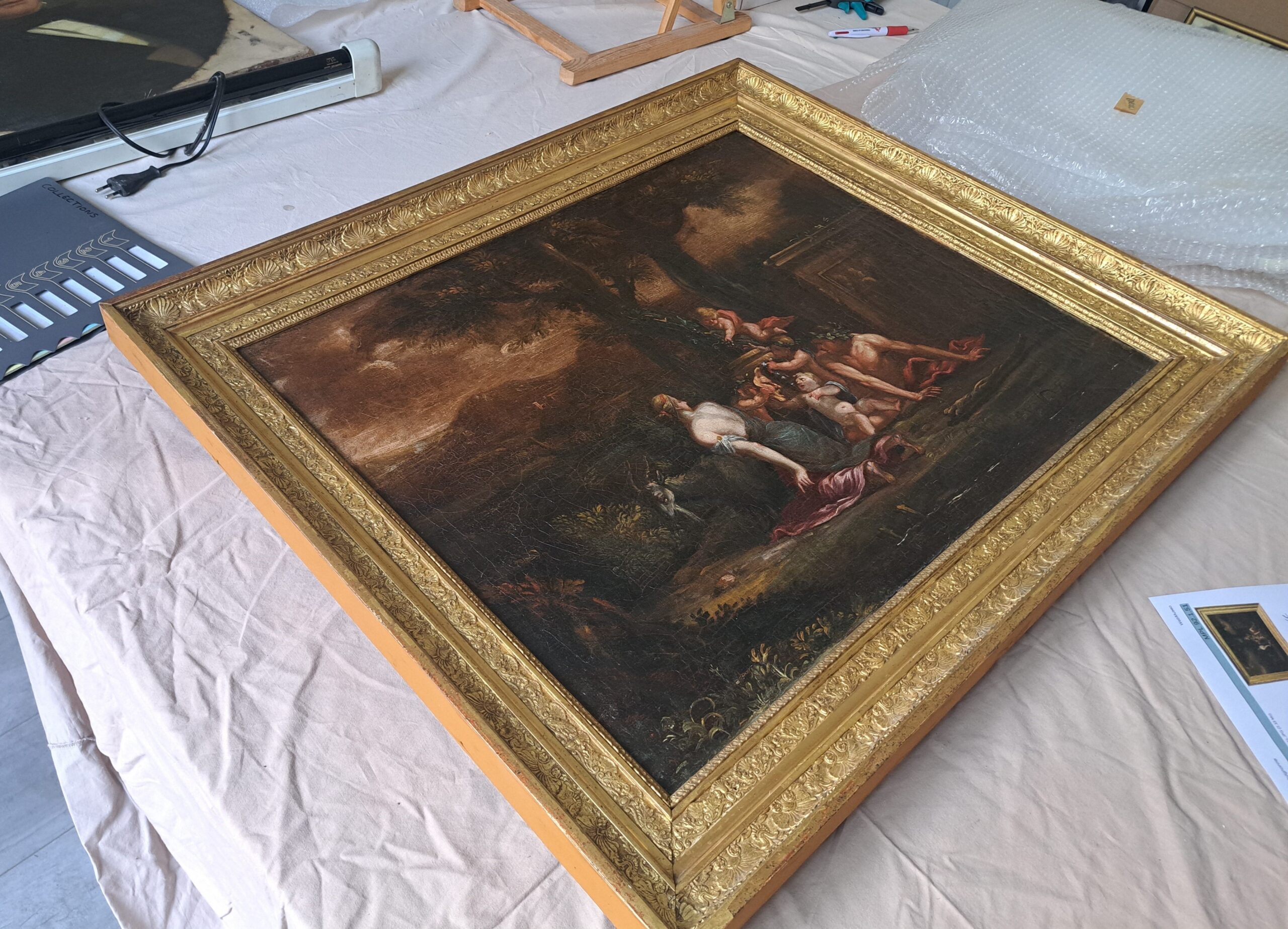 Cette Bacchanale évoque les fêtes bachiques inspirées du monde antique, scènes festives et sensuelles très appréciées dans la peinture européenne. Une fois restaurée, elle retrouvera sa place au musée, révélant toute la richesse de sa composition.